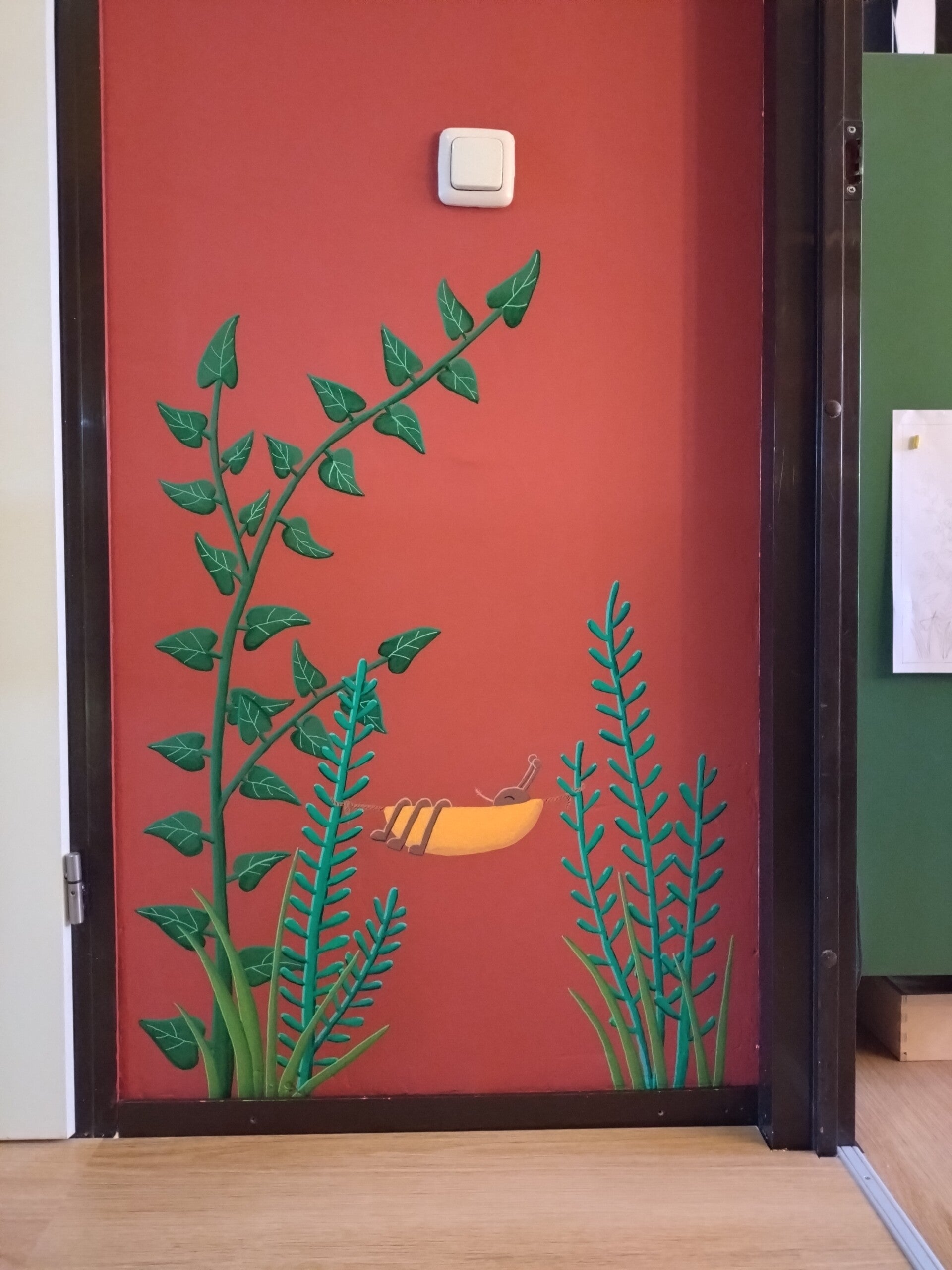 Recent heb ik mijn eerste een muurschildering gemaakt. Het doel was om een saai stukje van de hal wat op te vrolijken. Ik heb eerst wat verschillende schetsen gemaakt en er daarna eentje uitgewerkt op schaal. Dit heb ik vervolgens met acrylverf aangebracht op de muur.